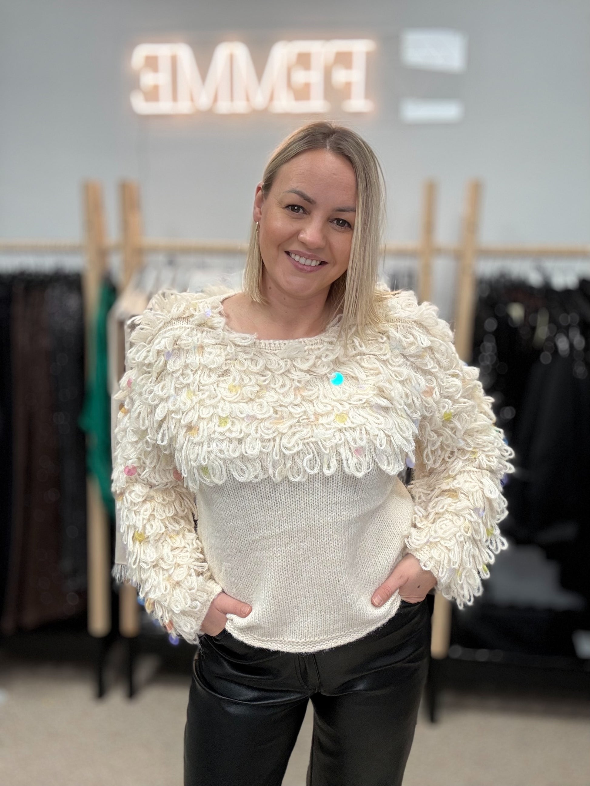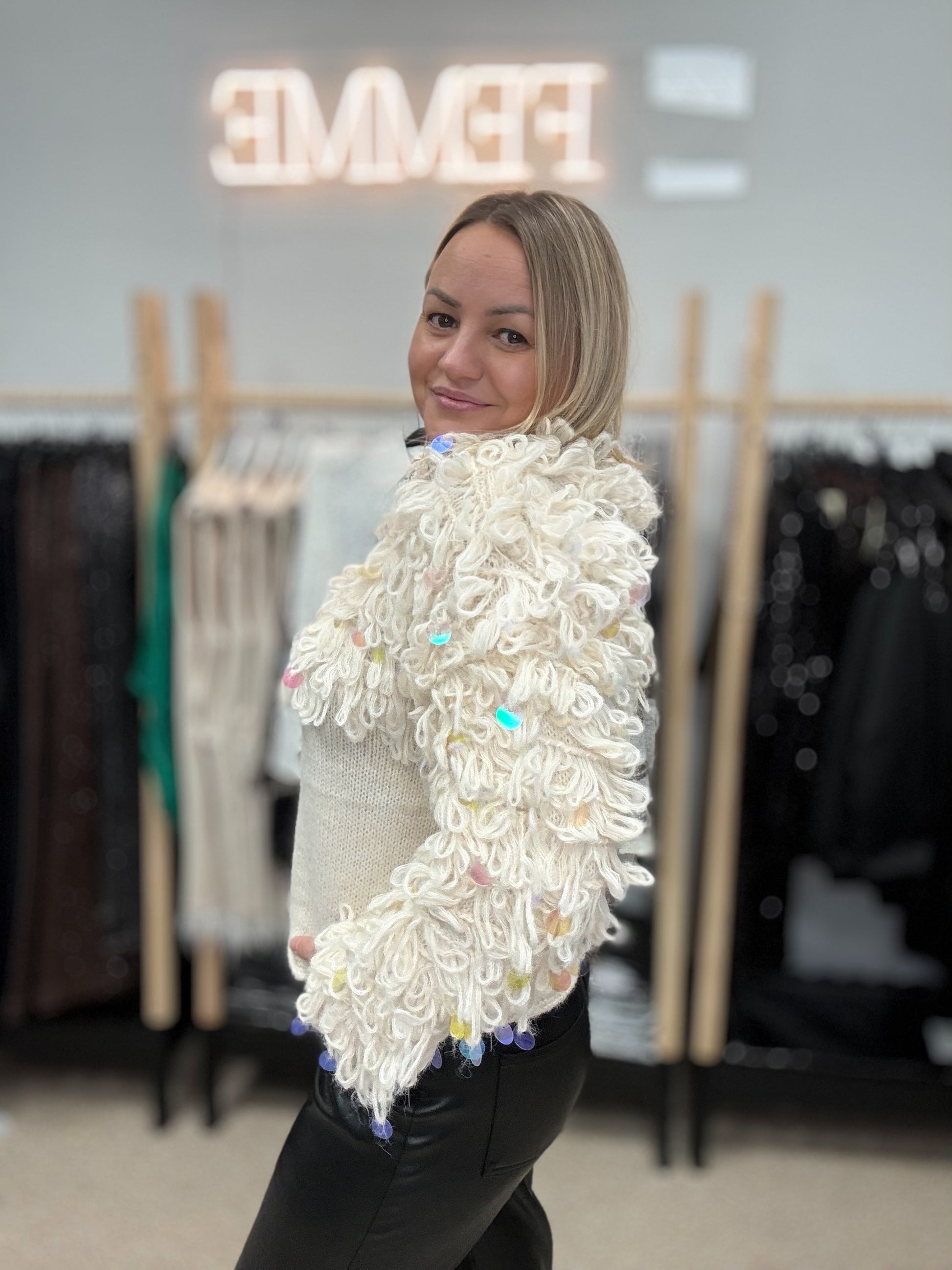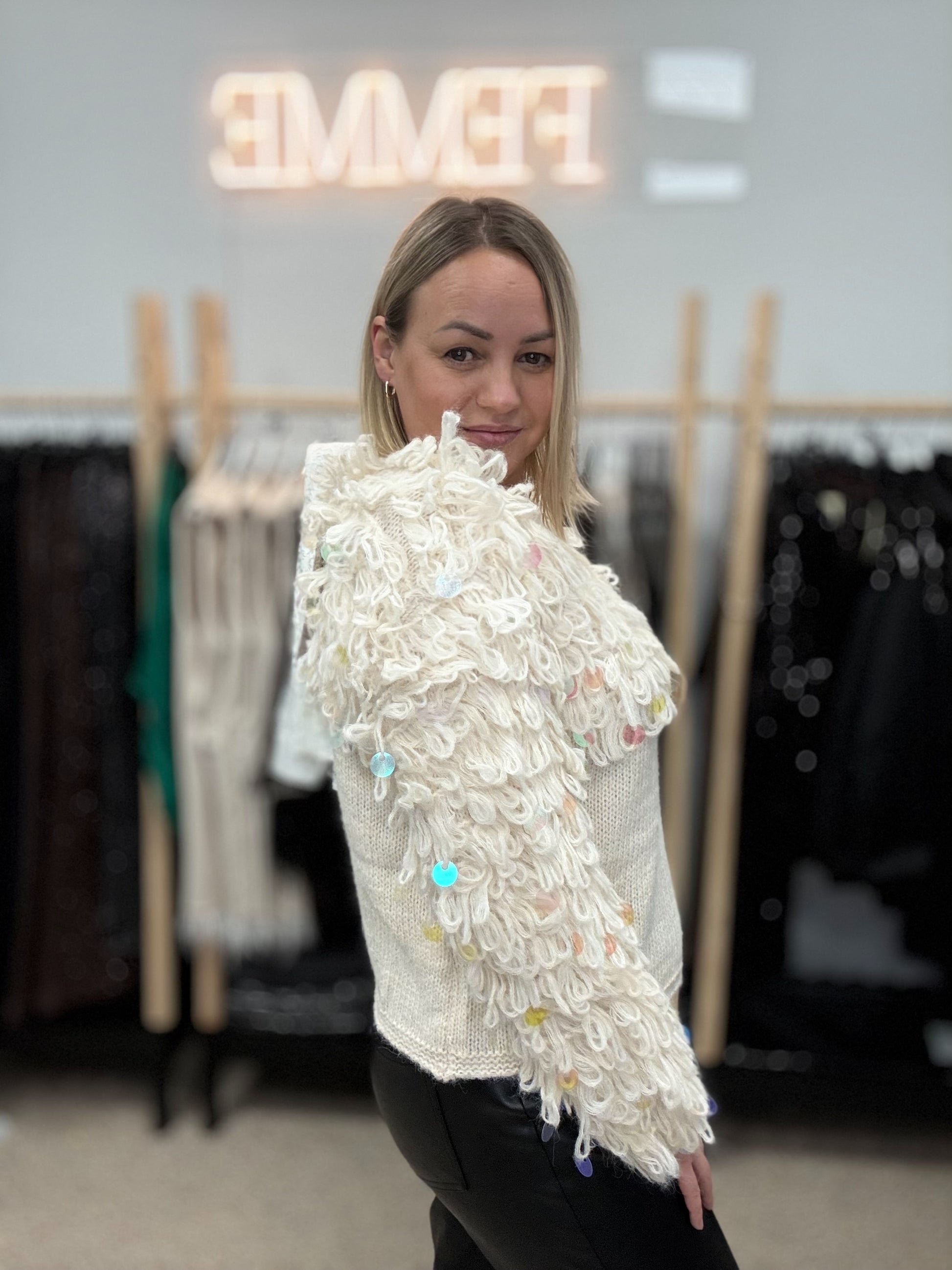 Piena balts džemperis ar cilpām un gliteriem.