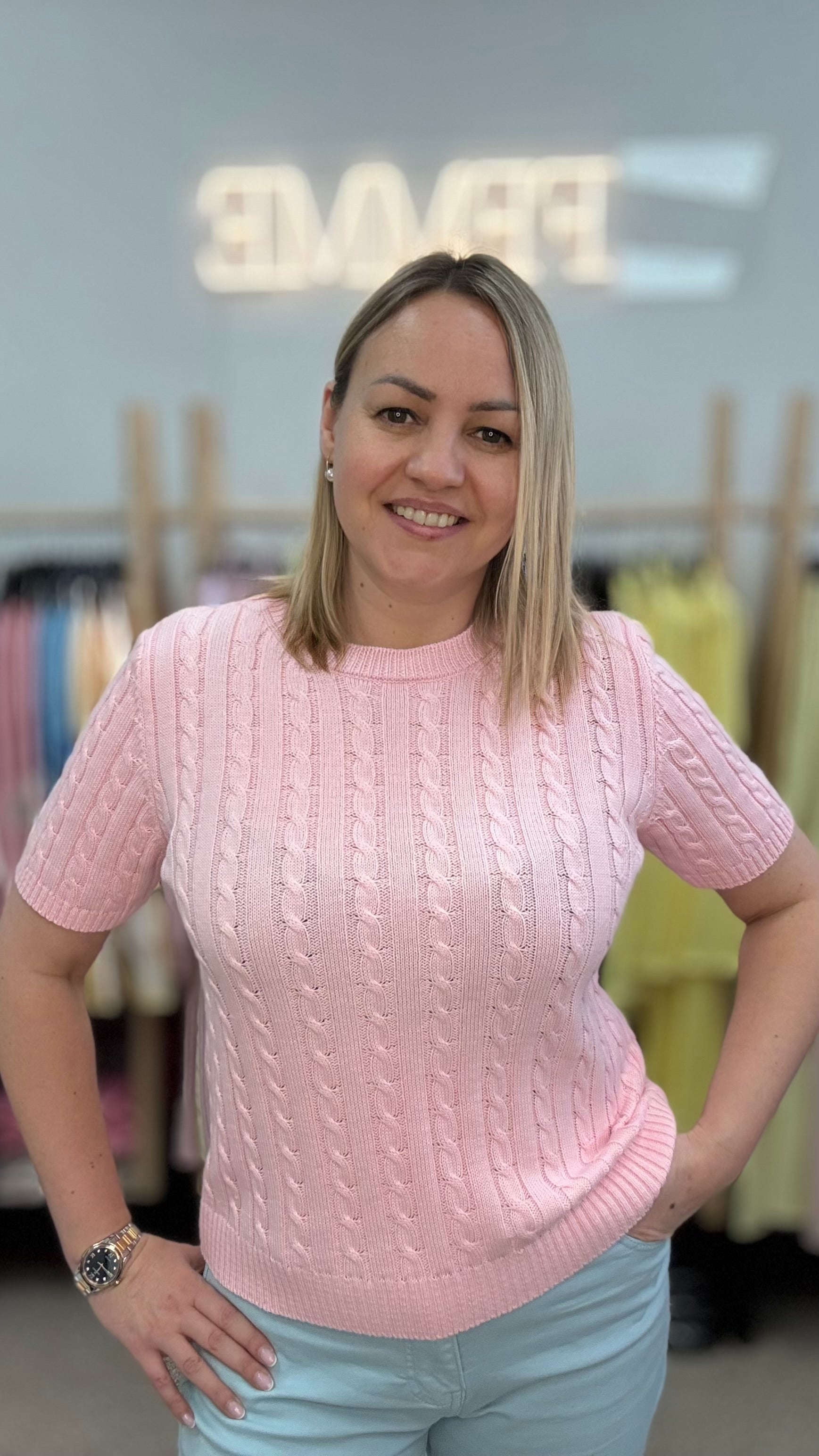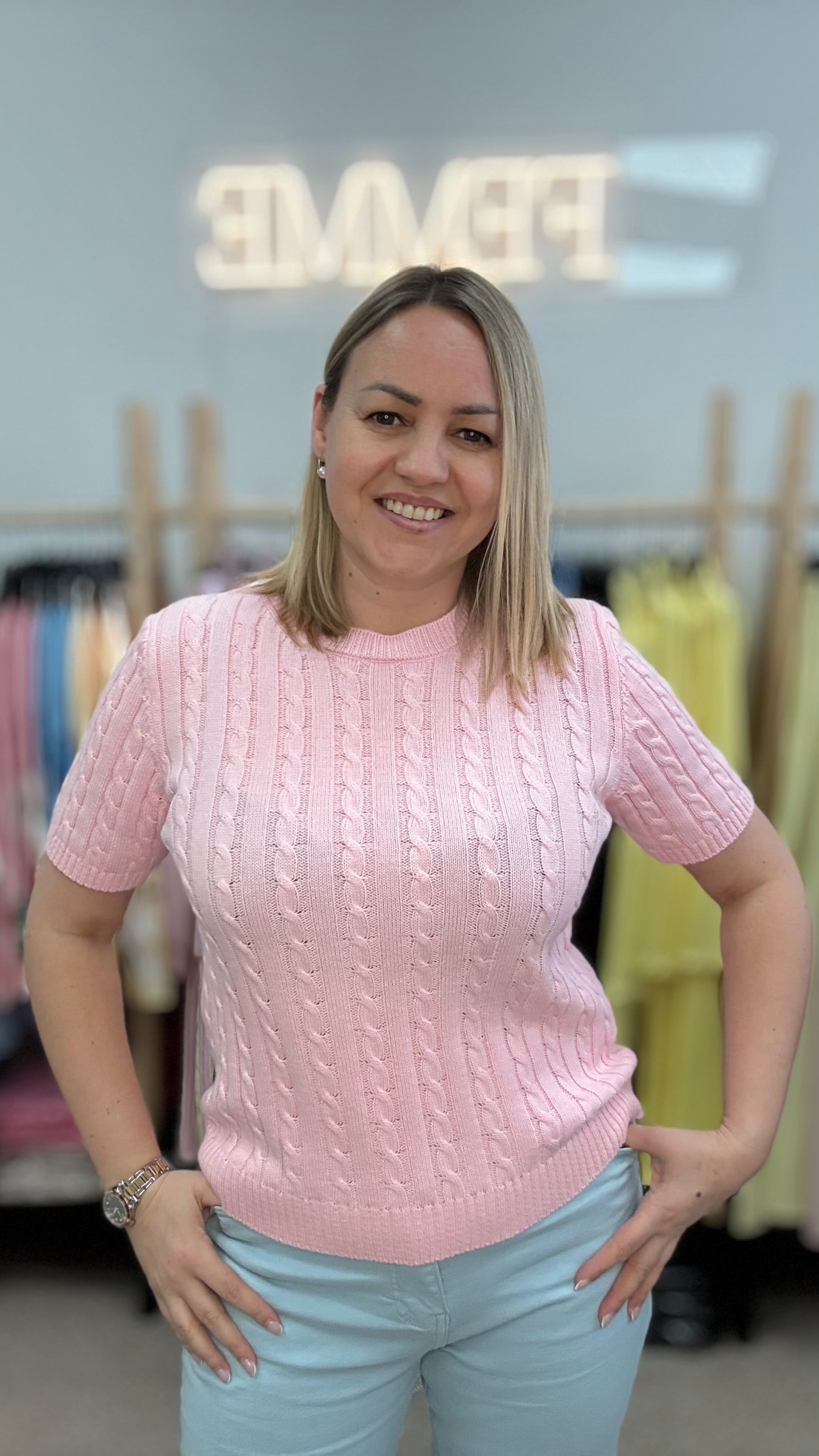 Розовый свитер с косами