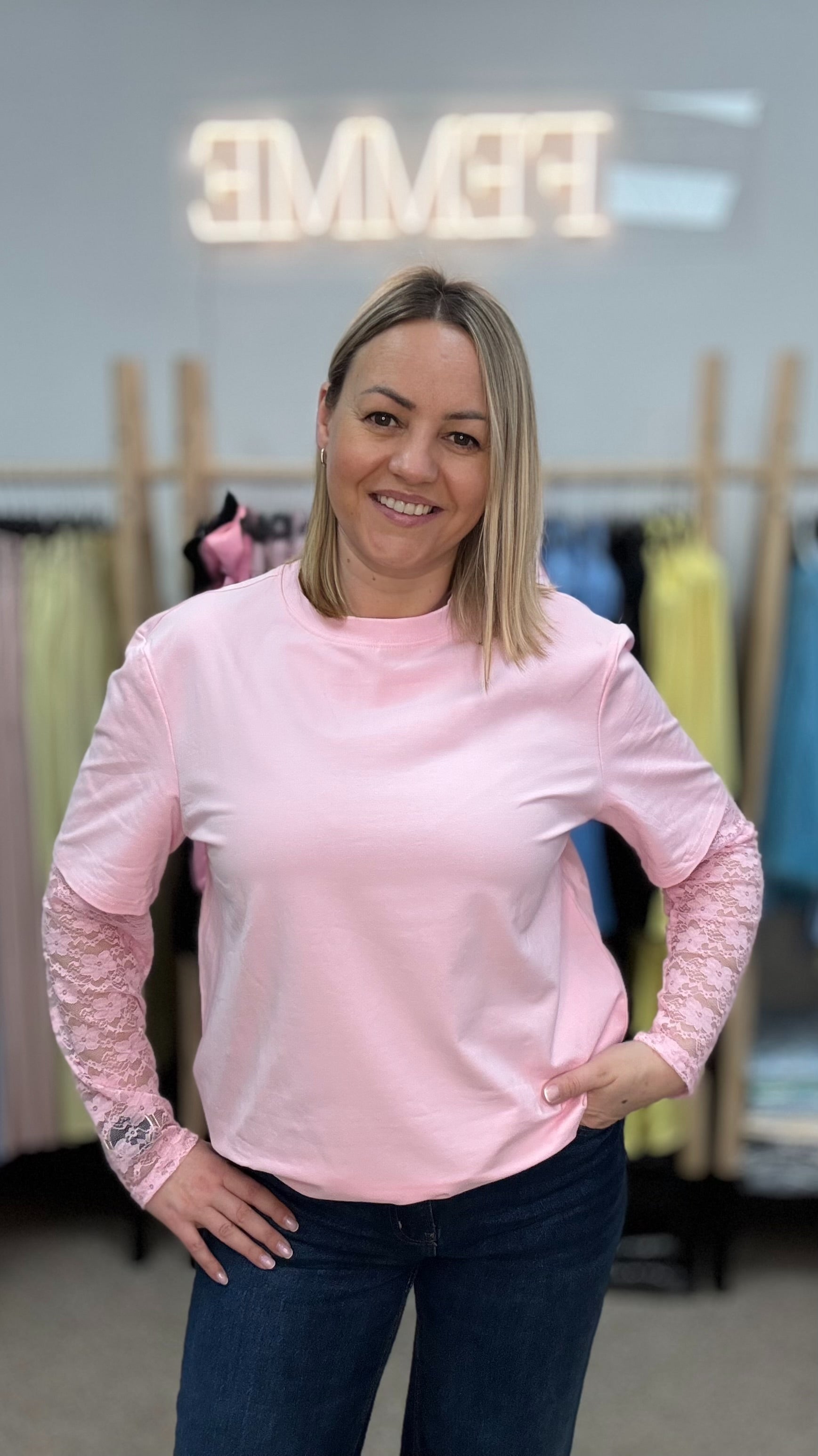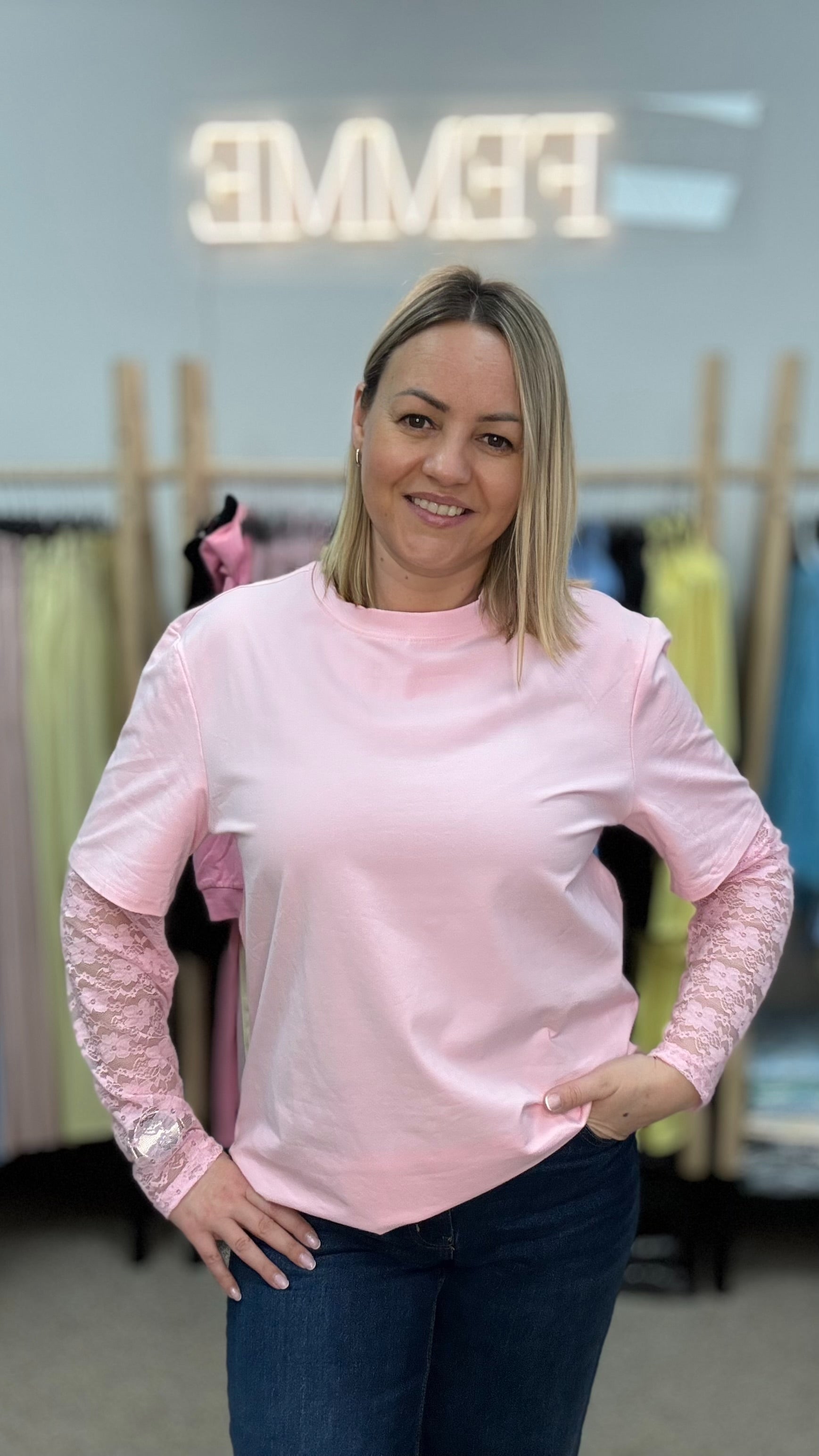 Розовая футболка с кружевными рукавами