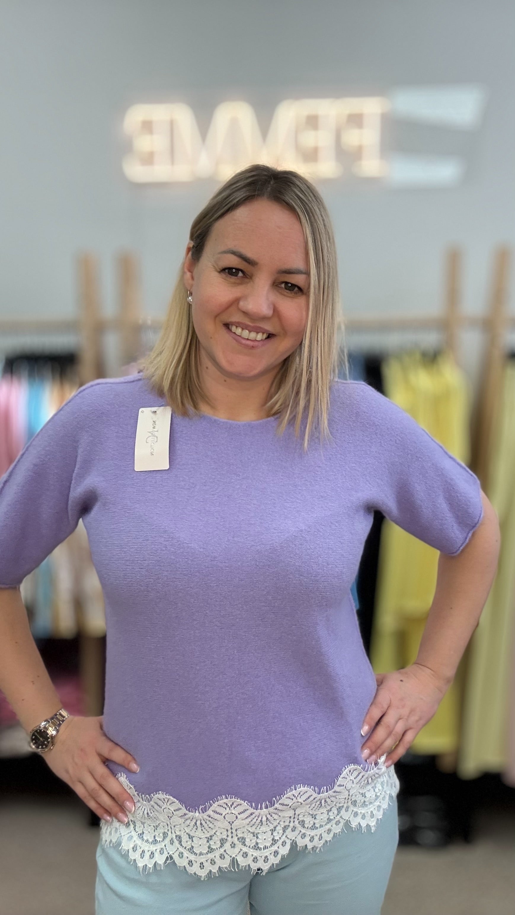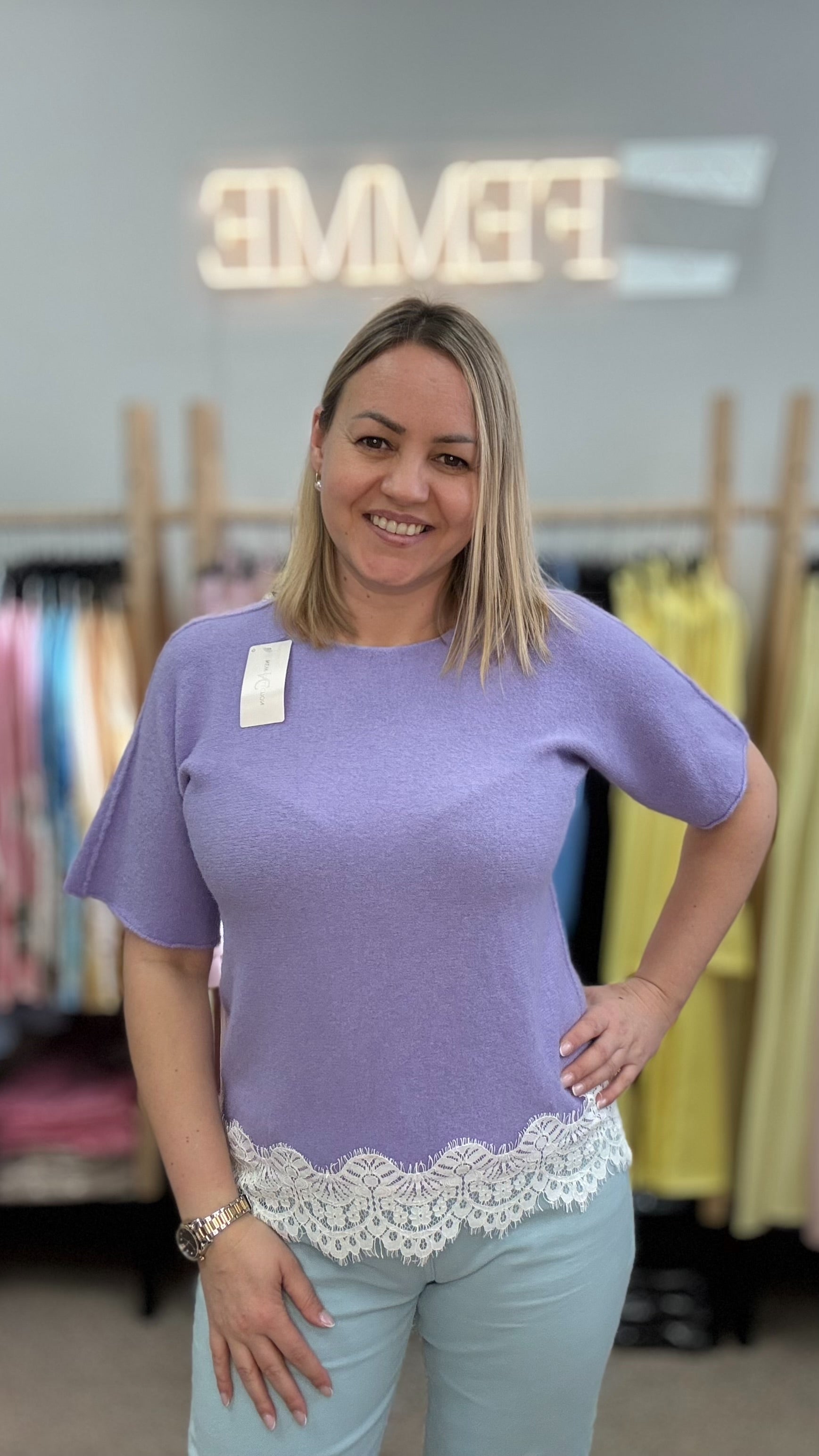 Сиреневый свитер с кружевной отделкой